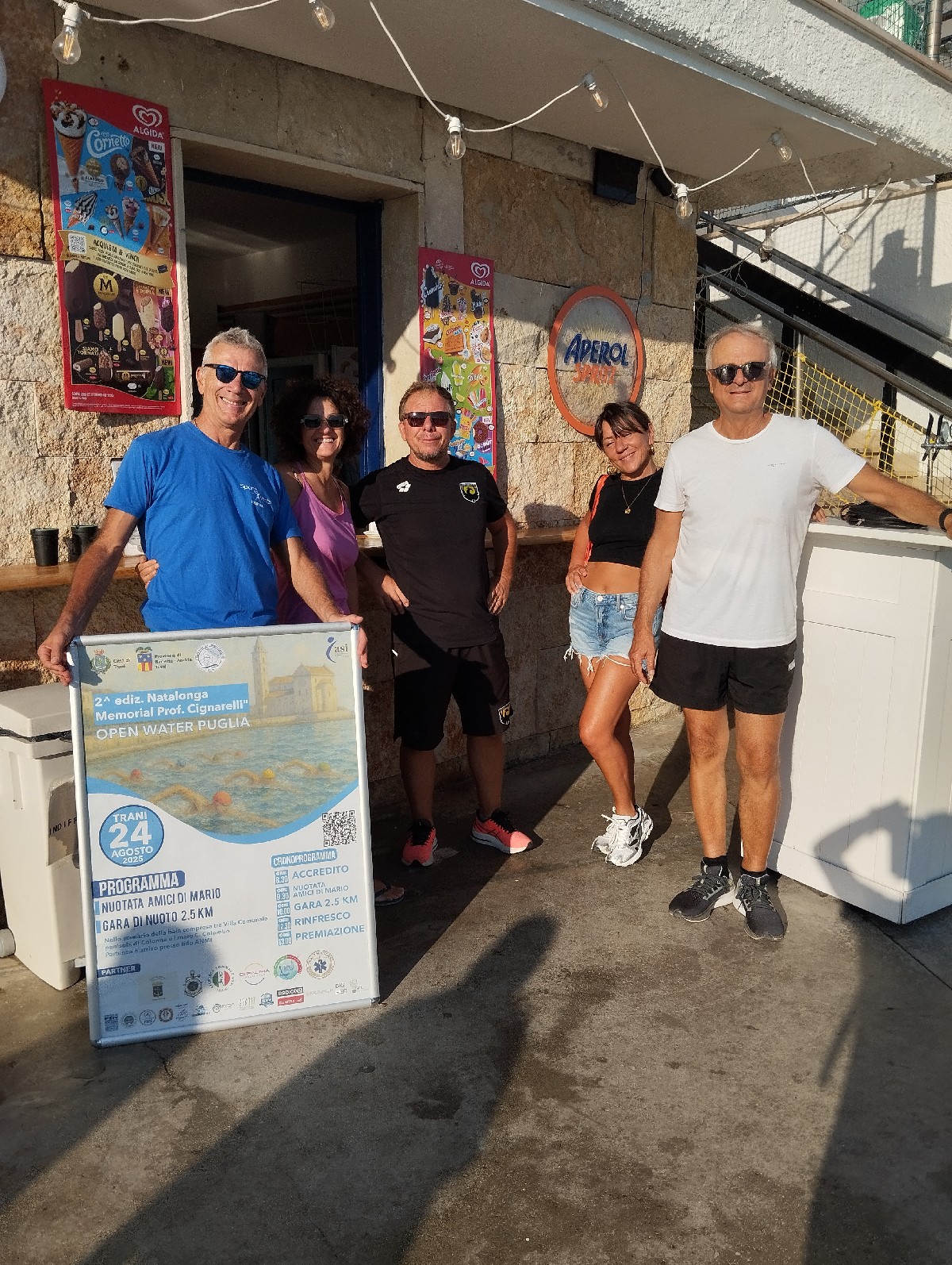 La riuscita della manifestazione è merito di un grande lavoro di squadra. L’Associazione “prof. Mauro Cignarelli ODV-ETS” ha potuto contare sul fondamentale contributo tecnico-organizzativo di Lorenc Feleqi e Ruggiero Messina (delegati regionali della FIN, federazione italiana nuoto) e sul supporto della Lega Navale, dell’ANMI, dell’associazione Amici del Mare, delle società sportive Tommaso Assi e Sport & Events, e di Tranisoccorso. Un ringraziamento particolare va anche a Poseidon Blu Team di Molfetta, alla Capitaneria di Porto di Barletta e Trani, alla compagnia della guardia di finanza di Trani, al servizio 118 Nautico di Trani, per il loro supporto essenziale alla sicurezza dell’evento. Presenza significativa (in assenza di altre autorità, civili) quella del vicecomandante dei Carabinieri della provincia BAT il tenente colonnello Pasquale De Corato, che ha portato i saluti dell’Arma. L’evento inoltre ha ottenuto il patrocinio gratuito del Comune di Trani, della provincia BAT e del CONI.